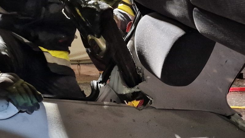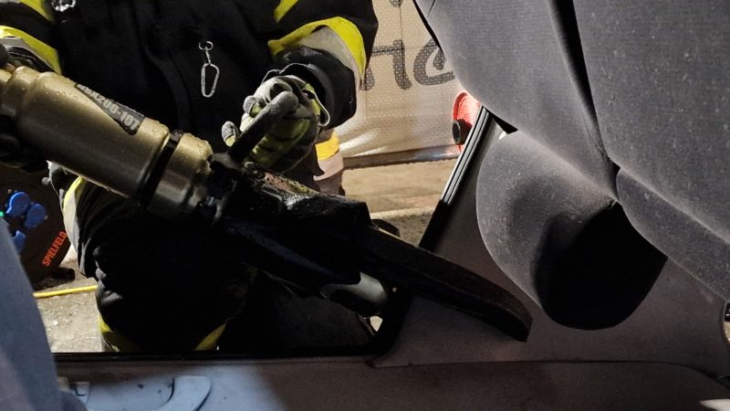 Nachdem die Rettungsöffnung vorbereitet war, begannen wir mit der schonenden Rettung. Das Dach wurde mit der Schlauchgebundenen Schere vom übrigen Fahrzeug abgeschnitten. Dabei wurde größtmögliches Augenmerk auf die Vorschrift, wie bei verletzten Personen in solchen Situationen vorgegangen werden muss, geachtet.