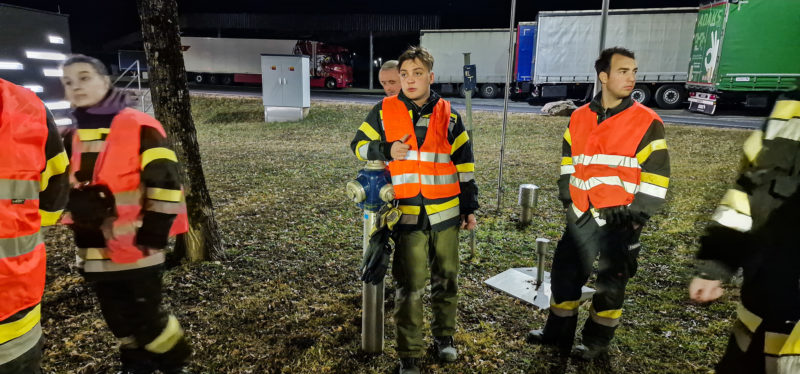 - ABI Michael Hanscheg ging gemeinsam mit OBI Ben Kugl den praktischen Teil durch. Da ging es hautsächlich um die Möglichkeiten, wie die Feuerwehr am schnellsten bei Einsätzen im Grenzbereich Spielfeld B67 und A9 zum Einsatzort gelangt – Umkehrmöglichkeiten direkt beim Grenzübergang – wo sich die Hydranten für die Wasserversorgung befinden. Weitere Punkte wie Auffahrtsmöglichkeiten, (für die Zivilbevölkerung versperrt) über die Asfinag, wo die Feuerwehr Zutritt über mehrere Schlüssel verfügt. Über das Duplet der Feuerwehr Spielfeld kann eine Wasserkarte abgerufen werden, damit beim Einsatz alle in nächster Nähe des Einsatzortes vorhandenen Wasserentnahmestellen (Hydranten) leicht zu orten sind. Des Weiteren wurden auch die zwei Parkplätze links und rechts der A9 besichtigt – Wasserversorgungsstellen erkundet und Zufahrtsmöglichkeiten ermittelt.