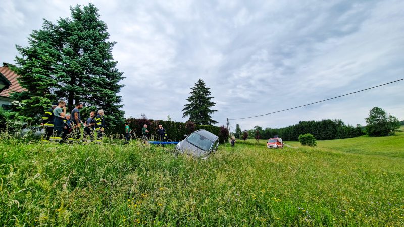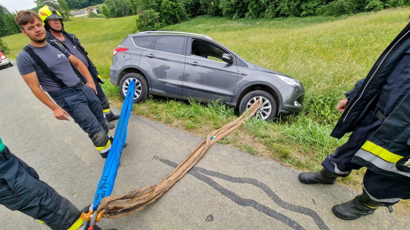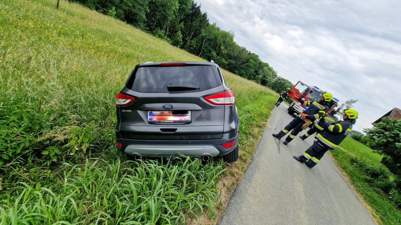 Mit RLF-A 2000 und MTF und 12 Mann am Einsatzort angekommen, wurde ein PKW neben der Fahrbahn (Gemeindestraße) vorgefunden. Die Insassen dieses PKWs standen schon unverletzt auf der Gemeindestraße. Der PKW stand auf der abgeböschten rechten Seite zur Straße in einer derartigen Schieflage und drohte seitlich zu kippen. Sofort wurde mit der Seilwinde des RLFA 2000 das Fahrzeug mit Gurten an beiden Rädern am Fahrzeug gesichert. Da sich dieses Fahrzeug in einer derartigen Lage befand und durch das Herausziehen mit der Seilwinde des RLFA 2000, am Fahrzeug ein erheblicher Schaden entstehen hätte können, wurde das Abschleppunternehmen Zirngast mit Kranwagen angefordert. Bis zum Eintreffen des Abschleppunternehmens wurde das Fahrzeug von der FF Spielfeld gesichert. Das Abschleppunternehmen Zirngast hob das Fahrzeug auf die Gemeindestraße, sodass die Fahrzeugbesitzerin ihre Fahrt per eigener Achse fortsetzen konnte. Durch diese sanfte Vorgehensweise der Bergung, entstand am Fahrzeug kein Schaden.