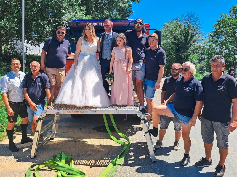 Am Samstag, dem 15. Juli 2023, rückte die Freiwillige Feuerwehr Spielfeld zu einem erfreulichen Anlass aus. Feuerwehrkollege Michael Kapaun heiratete seine Sandra mit Tochter Lena und die Florians durften diesen besonderen Tag gemeinsam mit ihnen feiern. Die Spielfelder Feuerwehrkollegen gratulierten Michael und Sandra recht herzlich zur Vermählung und wünschten ihnen für ihren weiteren gemeinsamen Lebensweg alles Gute!