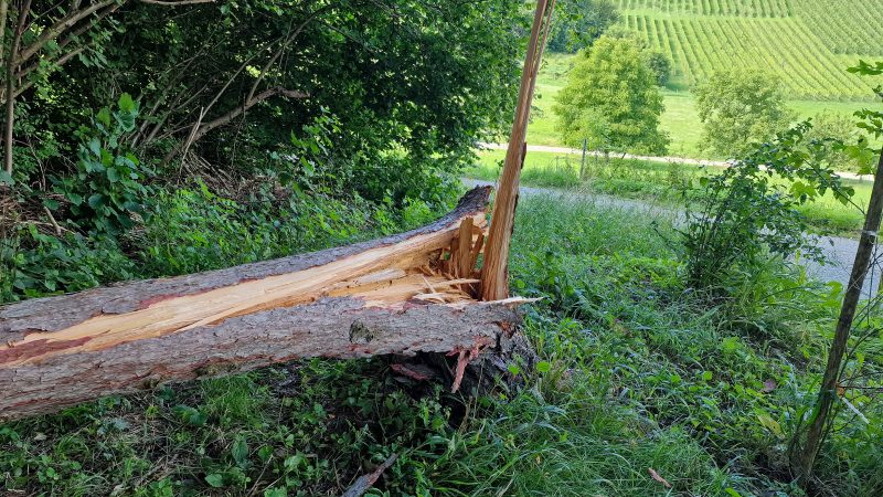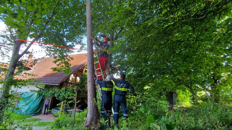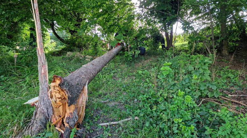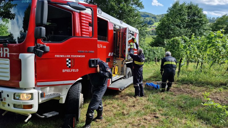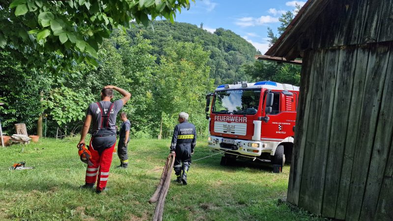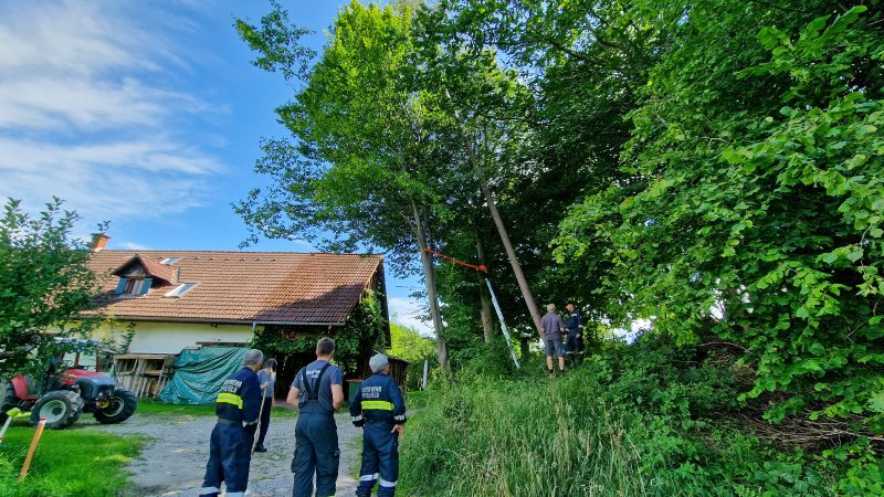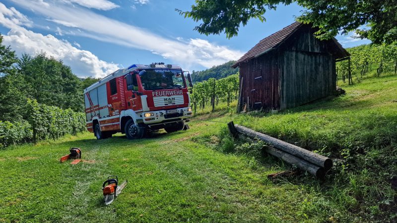 Zu einem stillen Alarm wurde heute in den späten Vormittagsstunden die Freiwillige Feuerwehr Spielfeld zu einen technischen Einsatz in den Graßnitzbergweg 8, telefonisch alarmiert. Beim angrenzenden Waldgrundstück des Hausbesitzers drohte eine ausgewachsene Lärche auf sein Haus zu stürzen. Bis zum Eintreffen der Feuerwehr Spielfeld, die mit RLFA2000 und LKWA besetzt mit 7 Mann ausrückte, wurde der umfallende Baum vom angrenzenden Nachbarn mit Ratschengurten gesichert. Nach Erkundung der Lage vom Kommandanten ABI Michael Hanscheg wurde der Baum mit der Seilwinde des RLFA2000 umgezogen und zu Boden gebracht. Nach Beendigung des Einsatzes rückte die FF Spielfeld wieder in das Rüsthaus ein und meldete der LLZ Steiermark über Funk ihre Einsatzbereitschaft zurück.