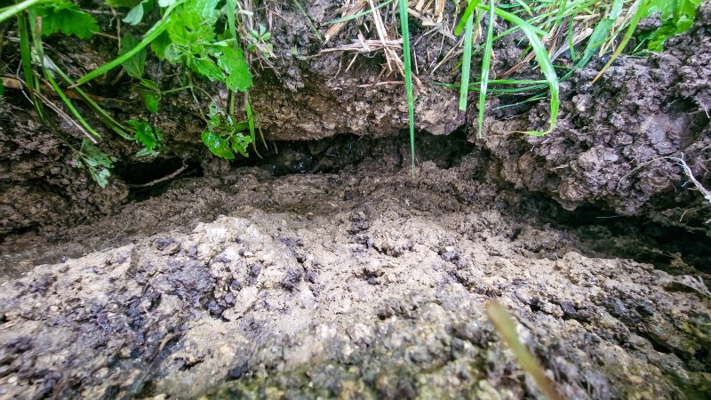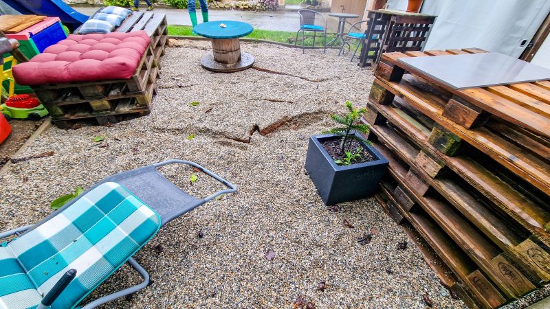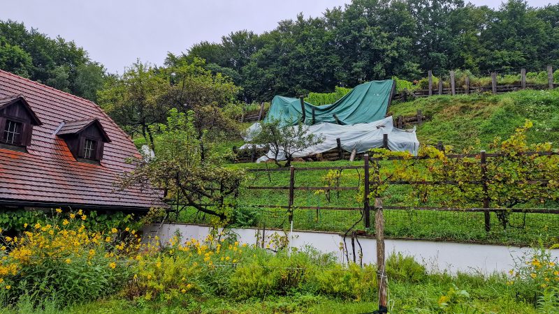 - Ein steiler Weingarten Am Graßnitzberg 33, weist waagrechte Sprünge im Erdreich auf. Wassermassen fließen quellartig aus dem Boden und schieben das Erdreich ins Tal.