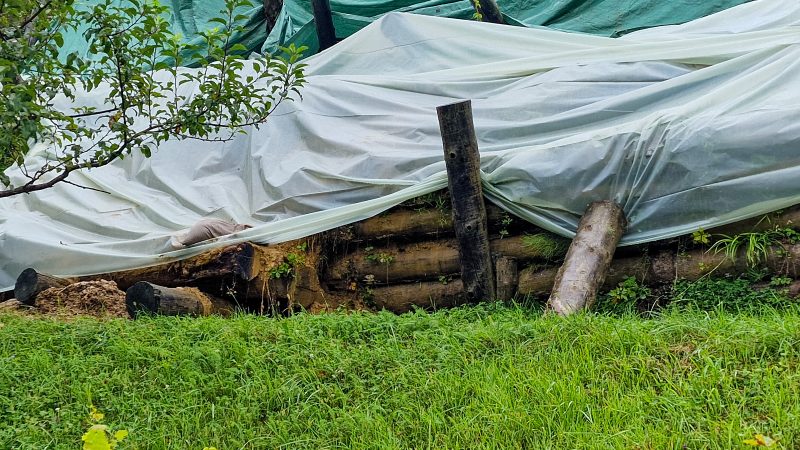 - Ein Hang am Graßnitzbergweg 17, bei einer Stützmauer aus Rundholz-Stäben sind die Holzsteher abgebrochen und das Erdreich droht auf das darunter stehende Haus zu fallen.