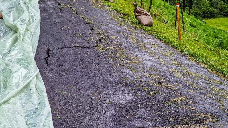 - Eine Zufahrt zu den Häusern Graßnitzbergweg 6 und 8, in der Straßenmitte im Asphalt sind auf einer Länge von 40 Metern tiefe Riss entstanden.