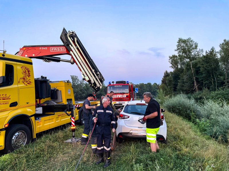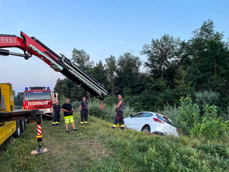Am 15.08.2024 um 19:03 Uhr wurde die Freiwillige Feuerwehr Spielfeld mittels Sirenenalarm zu einer Fahrzeugbergung T03, alarmiert. Der Vorfall ereignete sich am Kraftwerk Spielfeld, als ein Fahrzeug beim Umkehren vom Weg abkam und in Gefahr geriet, über die steile Uferböschung in den Gamlitzbach zu stürzen. Nach Erkundung der Lage konnte festgestellt werden, dass keine Gefahr für die Umwelt bestand und sich keine Personen im Fahrzeug befanden. Sofort wurde das Fahrzeug mithilfe der Feuerwehr-Fahrzeug-Seilwinden gesichern. Zur Bergung des Fahrzeugs wurde das Abschleppunternehmen Zirngast verständigt. Dank des professionellen Einsatzes der Feuerwehr und des Abschleppunternehmens konnte eine schnelle und sichere Bergung des Fahrzeugs gewährleistet werden.