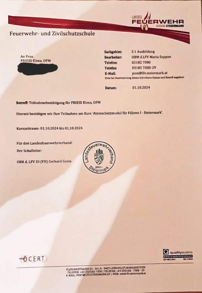 Elena Frieß hat am 01.10.2024 bis 01.10.2024 an der Feuerwehr und Zivilschutzschule in Lebring als Teilnehmerin das grundlegende theoretische Basiswissen eines Atemschutzgeräteträgers erlangt, seine Vorgehensweise verstehen und die Fähigkeit erlangen, einen Atemschutztrupp von außen zu überwachen. Damit erlangte Sie eine weitere Voraussetzung für den Lehrgang Führen I – Steiermark.