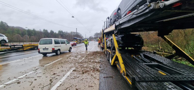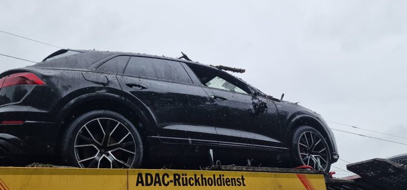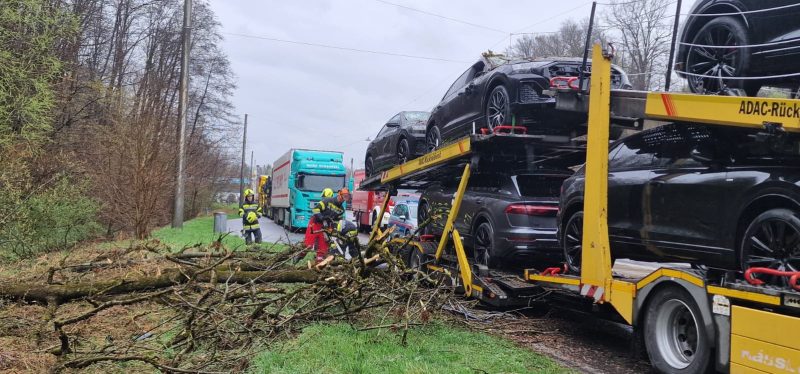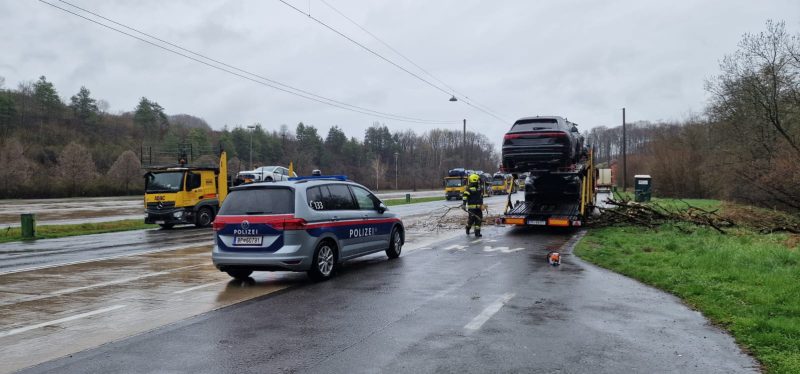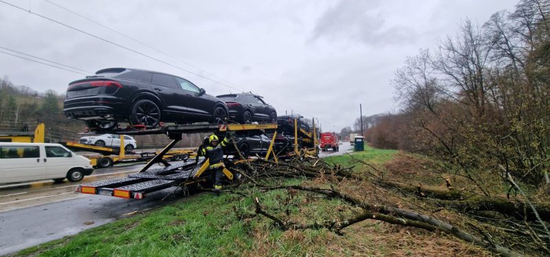 Entlang der alten Grenzbundesstaße (auf Höhe des aufgelassenen LKW-Parkplatz) knickte am Nachmittag des 29. März ein Baum um und traf direkt einen dort abgestellten Autotransport-LKW und beschädigte die geladen Neuwagen. Die Autos wurden beschädigt, bei einem Neuwagen wurde eine Seitenscheibe zerstört, diese wurde provisorisch abgedichtet bzw. abgeklebt. In weiterer Folge wurden herumliegen Baumteile von der Straße entfernt und der Baum von den Kameraden mit der Motorsäge zerkleinert und die Holzteile seitlich im Wald abgelegt, wo sie für keine Gefahr mehr sorgten. Nach über einer Stunde konnte der Einsatz beendet werden. Vielen Dank an alle Einsatzkräfte für die gute und professionelle Zusammenarbeit.