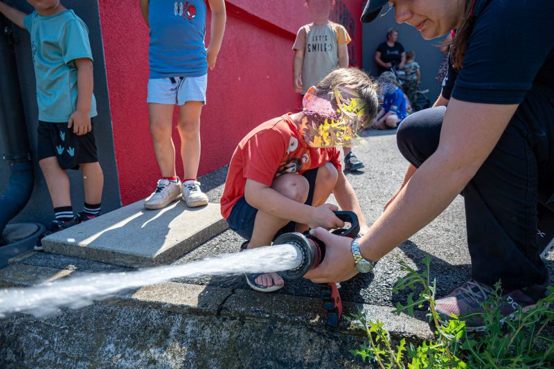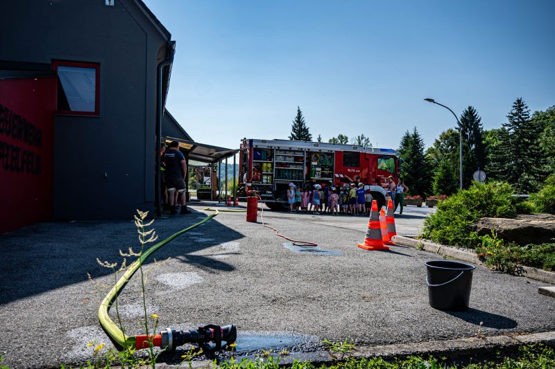 Am 25. Juni 2025 um 09:00 Uhr besuchte der Kindergarten Spielfeld die Feuerwehr Spielfeld. Begrüßt wurden die Kinder von der Jugendbeauftragten Elena Frieß. Sie führte die Kindergartenkinder in das Leben der Feuerwehr ein. Elena erklärte, welche Aufgaben die Feuerwehr hat und wie wichtig diese Arbeit ist. Anschließend durften die Kinder die verschiedenen Geräten der Feuerwehr in der Praxis kennenlernen. Die Kinder lernten, wie man ein Tragetuch richtig benutzt und wie eine Kübelspritze funktioniert, auch das Handling einer Löschleitung mit C-Strahlrohr durften die Kinder ausprobieren. Die Feuerwehrleute beantworteten geduldig alle Fragen der neugierigen Kinder und erklärten, wie wichtig es ist, im Notfall Ruhe zu bewahren. Nach den praktischen Übungen gab es eine kurze Getränkepause. Anschließend wurden die Kindergartenkinder mit den Feuerwehrautos zurück in den Kindergarten gebracht. Bei der Rückfahrt durften die Kinder sogar einmal das Martinshorn des Feuerwehrautos ausprobieren. Die Zusammenarbeit zwischen dem Kindergarten Spielfeld und der FF Spielfeld war ein voller Erfolg und hat den Kindern einen spannenden und lehrreichen Tag beschert.
