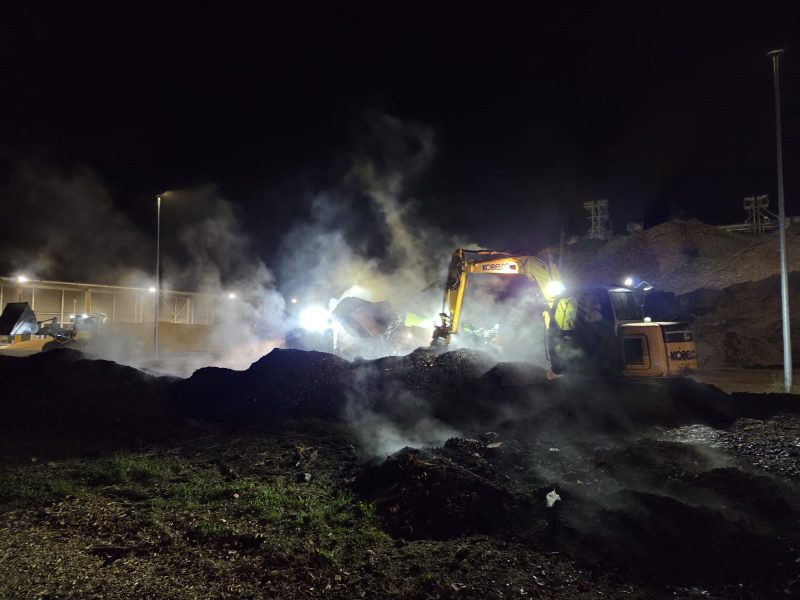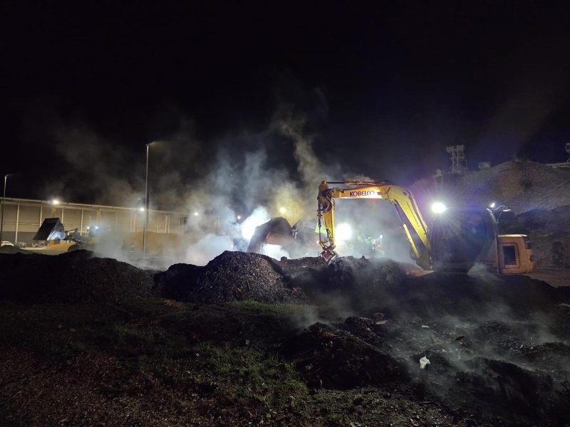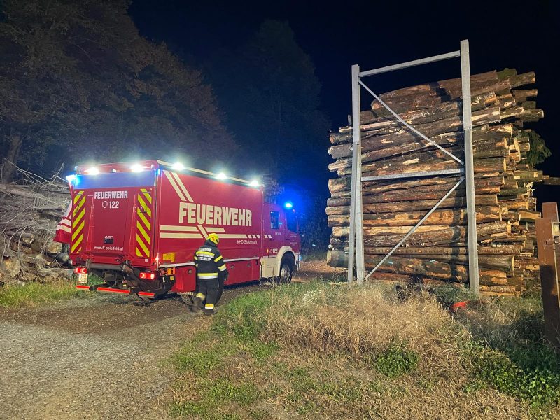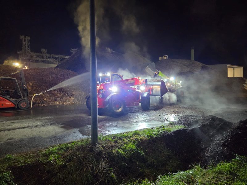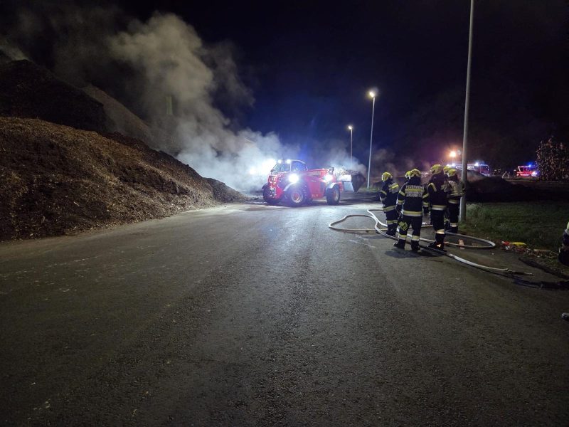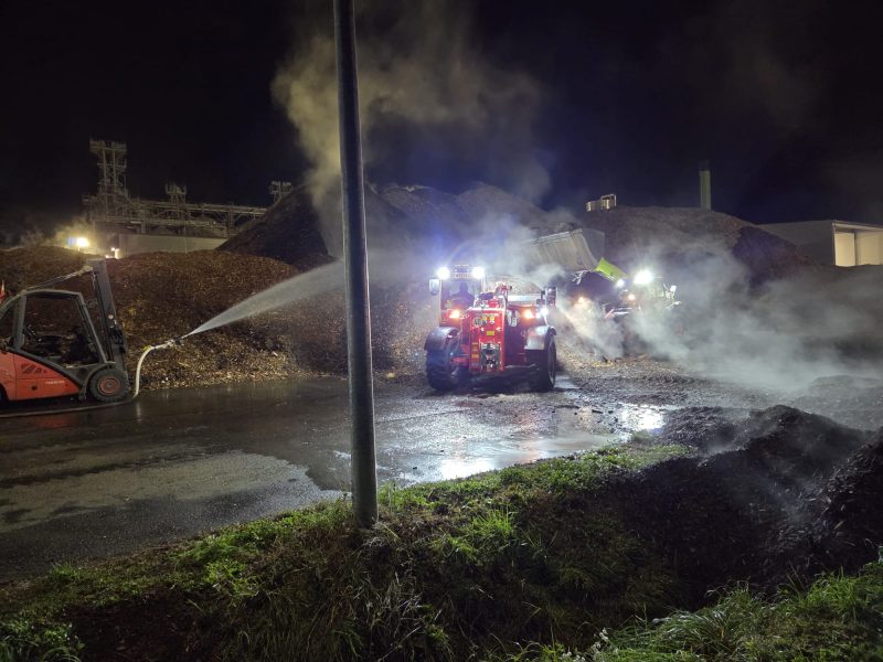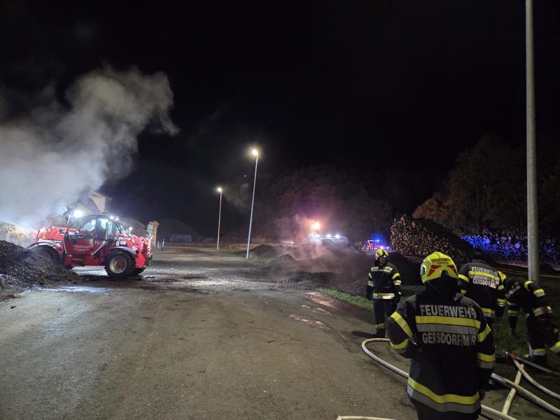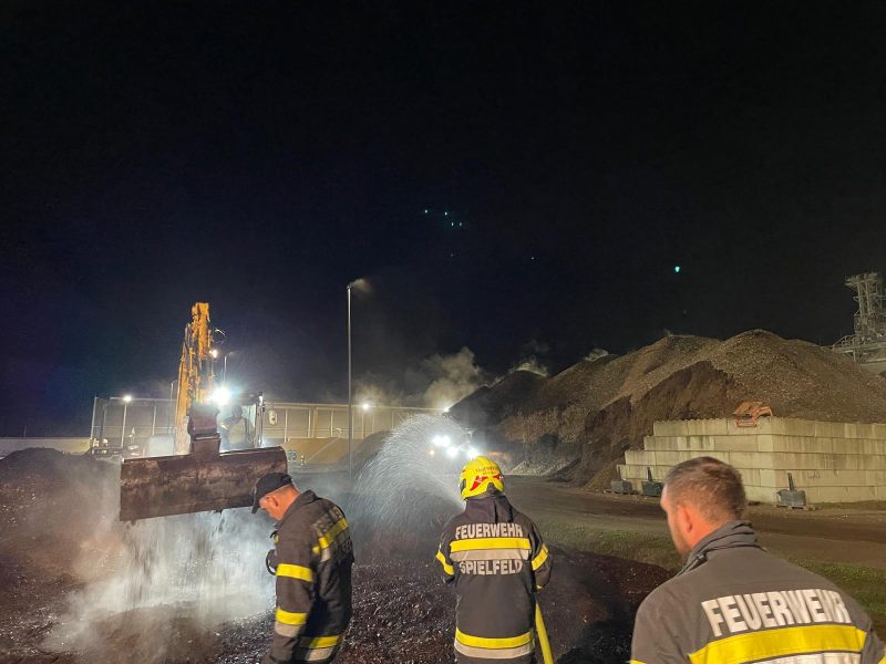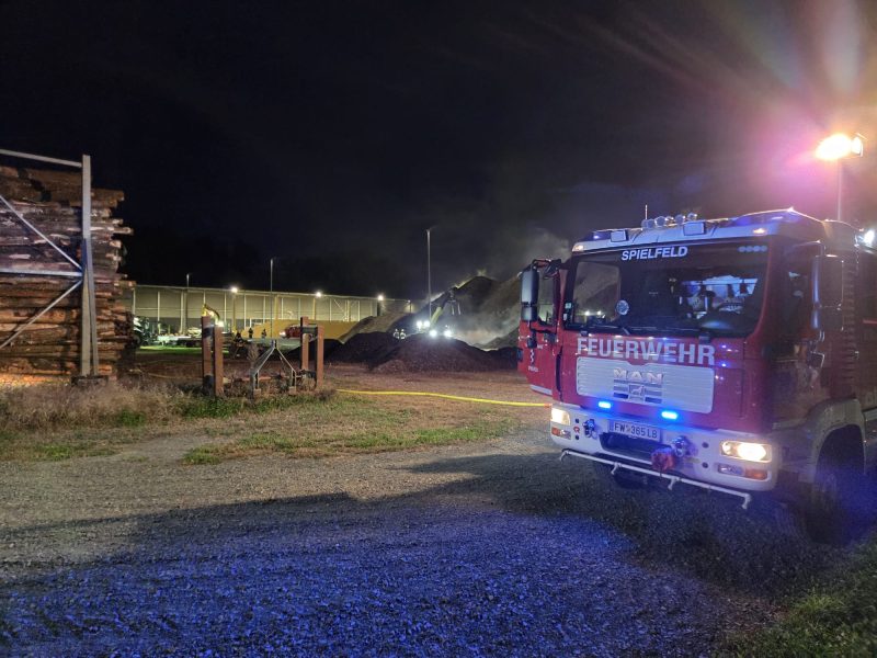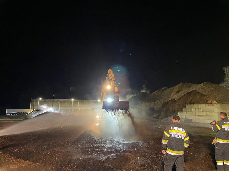 Am 17.10.2025 um 17:58 Uhr wurde die FF Spielfeld gemeinsam mit der FF Gersdorf zu einem Hackgut-Lager-Brand in das Industriegebiet Gersdorf alarmiert. Die Freiwillige Feuerwehr Spielfeld rückte unverzüglich mit RLF-A 2000, LKW-A und MTF-A und 13 Mann zum Einsatzort aus.  Am Einsatzort angekommen, bestanden unsere Aufgaben darin, das von Radlader und Teleskoplader verteilte brennende Hackgut sorgfältig abzulöschen und ein Wiederentflammen zu verhindern.  Zur weiteren Unterstützung bei der Verteilung der ca. 20.000 m³ im Lager befindlichen Hackschnitzel wurden im Laufe des Einsatzes seitens der Einsatzleitung Gersdorf auch die Bereichsstützpunkt-Teleskoplader Heimschuh (BFV Leibnitz) und Hof bei Straden (BFV Radkersburg) nachalarmiert.  Mit vereinten Kräften gelang es den mitwirkenden Einsatzkräften, das brennende Hackgut abzulöschen, wodurch nur mehr die FF Gersdorf und Mitarbeiter des Betriebes für letzte Glutnester und weitere Kontrollen am Einsatzort benötigt wurden.  Somit konnte die FF Spielfeld sich um 23:30 Uhr, wieder mit allen Fahrzeugen im Rüsthaus eingerückt, einsatzbereit melden.