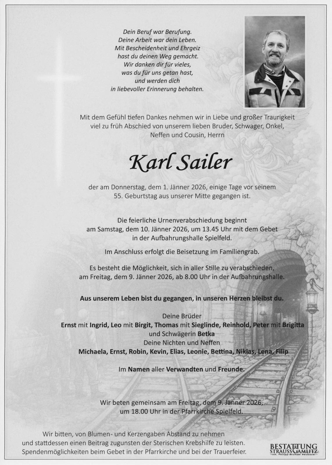 Die Freiwillige Feuerwehr Spielfeld hat die traurige Pflicht mitzuteilen, dass unser langjähriger Kamerad, LM Karl Sailer am Donnerstag, den 1. Jänner 2026 verstorben ist.