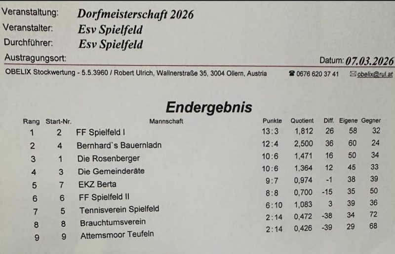 Die Rangliste: 1. FF Spielfeld I, 2. Bernhard´s Bauernladn, 3. Die Rosenberger, 4. Die Gemeinderäte, 5. EKZ Berta, 6. FF Spielfeld II, 7. Tennisverein Spielfeld, 8. Brauchtumsverein, 9. Attemsmoor Teufeln